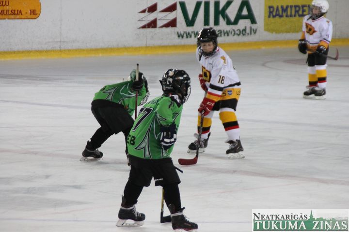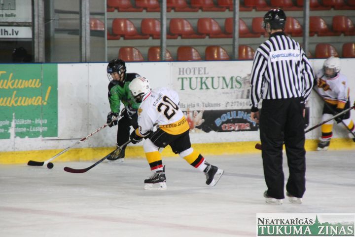 Abas komandas startē U-11 vecuma un B grupā. Pirmajā periodā komandas cīnījās punkts punktā. Pirmos vārtus 36. spēles sekundē atklāja tukumnieki, bet neilgi pēc tam arī viesu komanda nepalika parādā, veiksmīgi izcīnot divus punktus. Taču īsi pirms došanās pārtraukumā vārtu skaitu izlīdzināja mājinieki, gūstot vēl vienus vārtus. Rezultāts, noslēdzot pirmo periodu – 2:2. Otrajā periodā mājas komanda jau sāka vairāk spuroties pretī un ierādīt, kura laukumā tad notiek spēle, ļaujot viesiem realizēt tikai vienu veiksmīgu vārtu guvumu, bet paši realizēja četrus. Otrā perioda beigās rezultātu tablo rādīja – 6:3. Trešais periods jau pārvērtās asā cīņā, kur mazie hokejisti teju ik pa minūtei dabūja vienas minūtes noraidījumu gan par klupināšanu, gan par rupjību un pretinieka turēšanu ar nūju – šajā jomā diemžēl komandas bija līdzīgas, katra ieguva sev pa trim noraidījumiem, bet, neskatoties uz to, tikai mājiniekiem izdevās gūt punktus, noslēdzot spēli ar bezierunu uzvaru – 13:3.