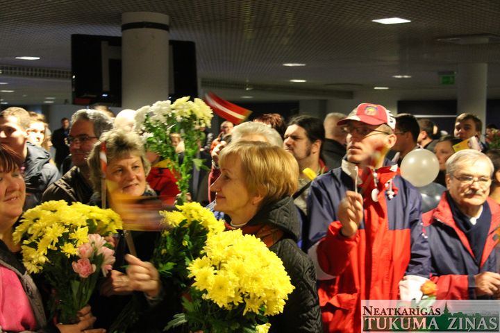 Reisam Maskava-Rīga bija jāielido 10.00, bet tas kavējās un bronzas medaļnieki lidostā «Rīga» nolaidās 12:14. Lidostā «Rīga» svinīgajā sagaidīšanā sportistus un trenerus sagaidīja vairāk nekā 150 atbalstītāju un radinieku un ne mazums mediju pārstāvju.