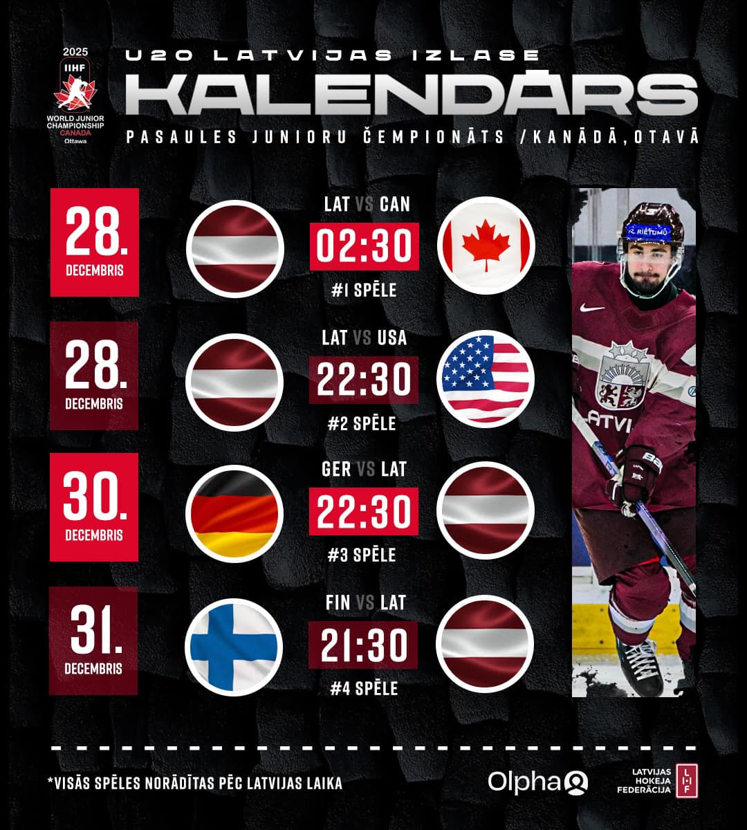 Jau šodien, 26. decembrī Kanādā sāksies pasaules čempionāts hokejā U-20 vecuma grupā elites divīzijā. Latvijas izlasei kopā ar galveno treneri Arti Ābolu pirmā spēle ieplānota agrā 28. decembra rītā (2:30 pēc Latvijas laika), kad tā stāsies pretī mājiniekiem – Kanādas jaunajiem hokejistiem.