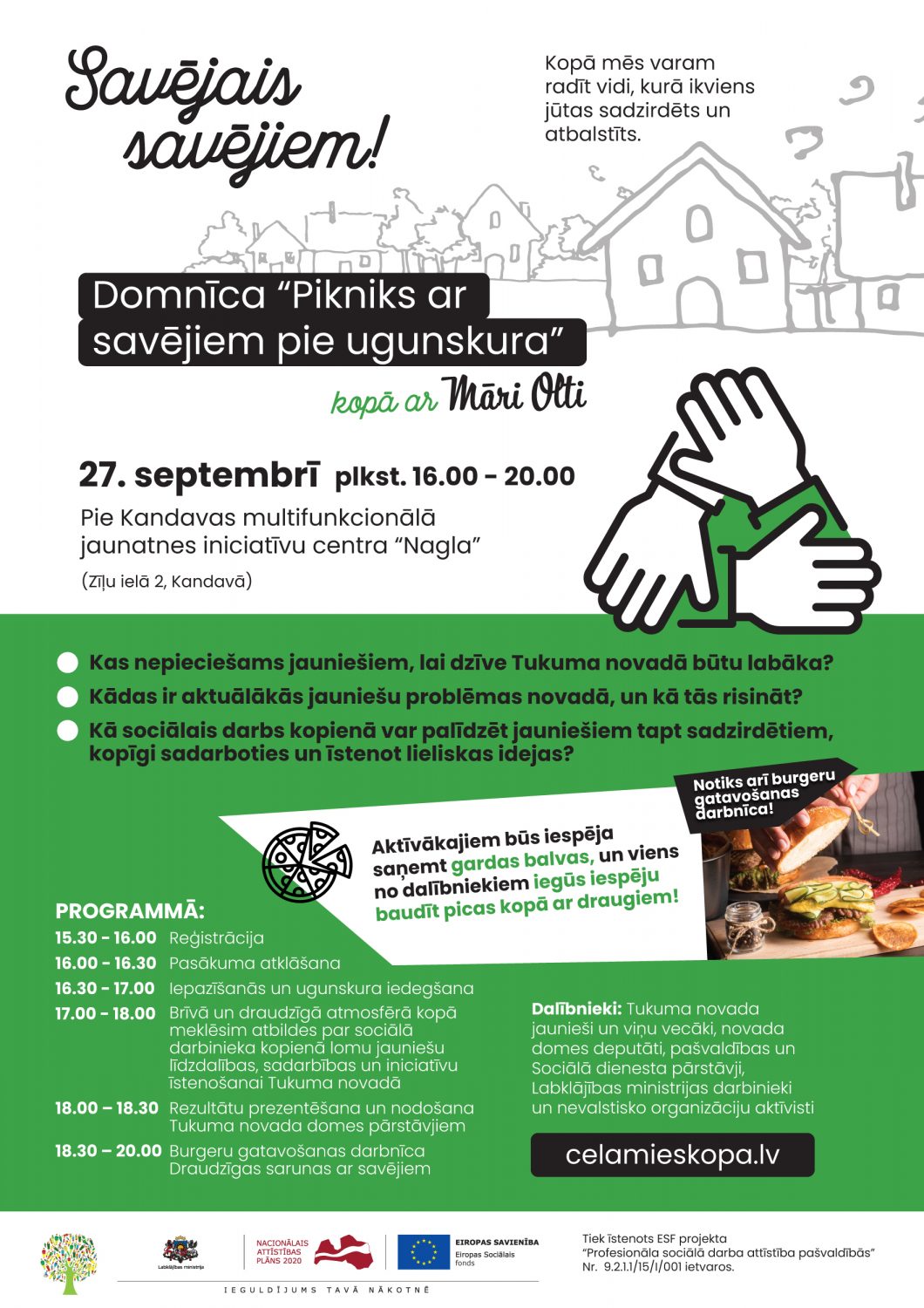 Domnīca “Pikniks ar savējiem pie ugunskura” notiek Labklājības ministrijas (LM) organizētās kampaņas “Savējais savējiem!” ietvaros, kas šī gada rudenī notiek visā Latvijā. Kampaņa tiek rīkota, noslēdzoties LM īstenotajam pilotprojektam “Sociālais darbs kopienā”, kura mērķis ir sociālo problēmu risināšana un to preventīva novēršana kopienas līmenī, aizsniedzot neaizsargātākās iedzīvotāju grupas, aktivizējot kopienu iekšējos resursus un veicinot sadarbību starp iedzīvotājiem un pašvaldības vadību. Atšķirībā no sociālā darbinieka, kura uzdevumi ir saistīti ar individuālu atbalstu grūtībās nonākušiem cilvēkiem, sociālais darbinieks kopienā fokusējas uz sociālo problēmu prevenci, aktīvi iesaistoties visas kopienas dzīvē. Neskatoties uz būtiskajiem ieguvumiem iedzīvotājiem, šobrīd Latvijā sociālais darbinieks kopienā kā amata vieta ir tikai nelielā skaitā pašvaldību.
