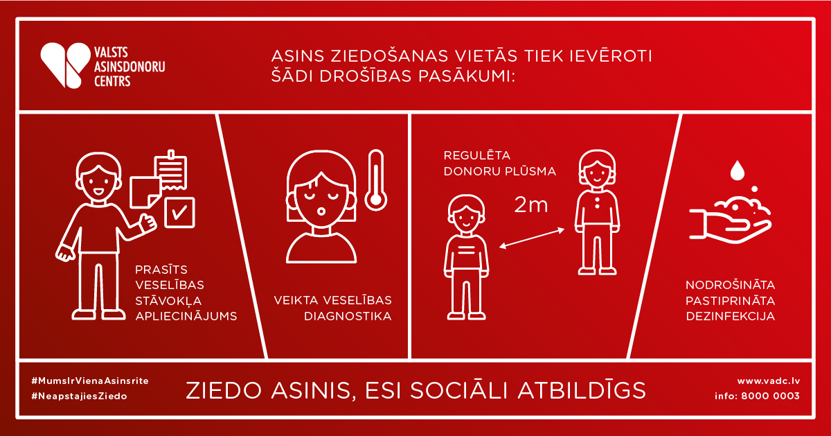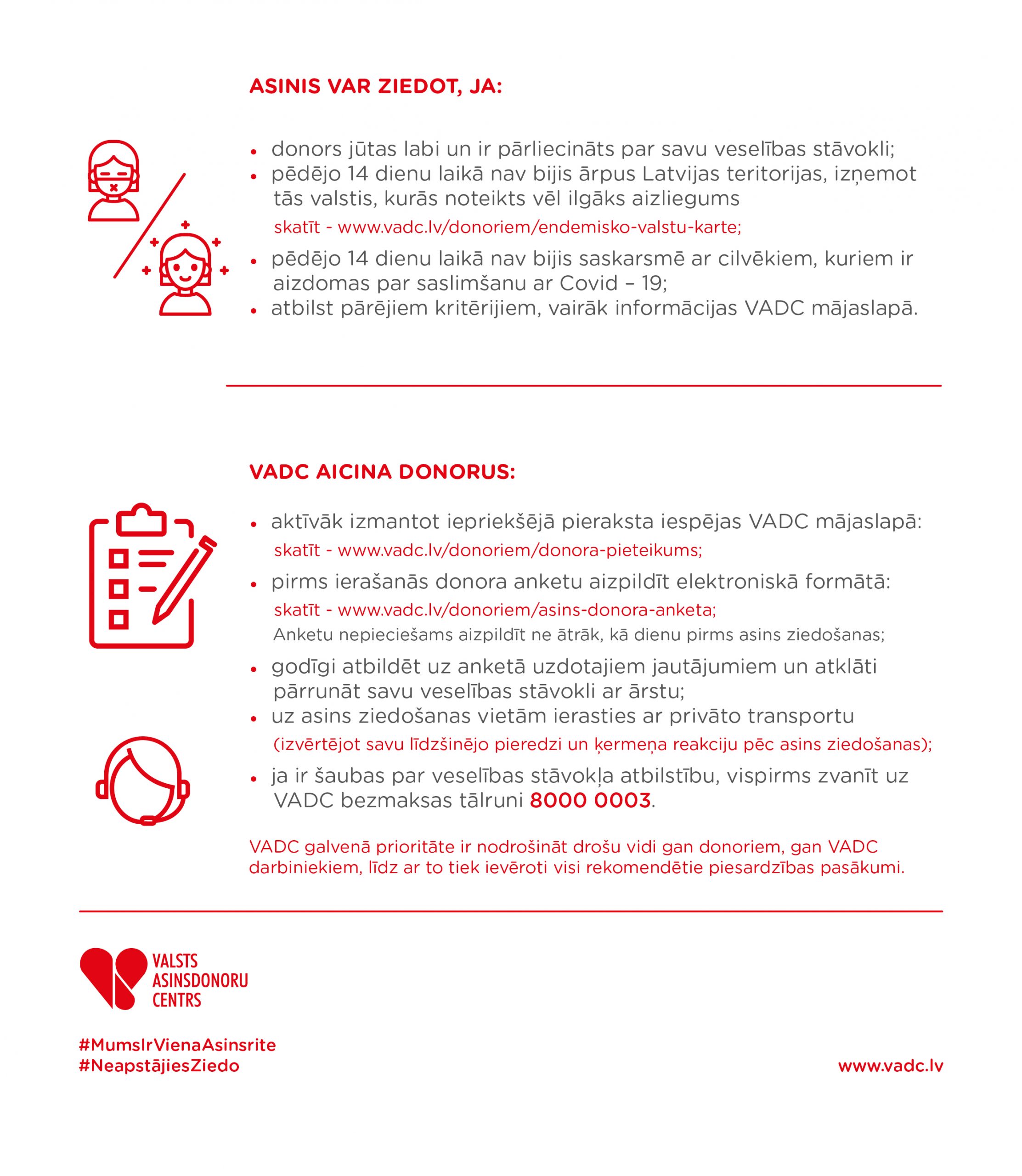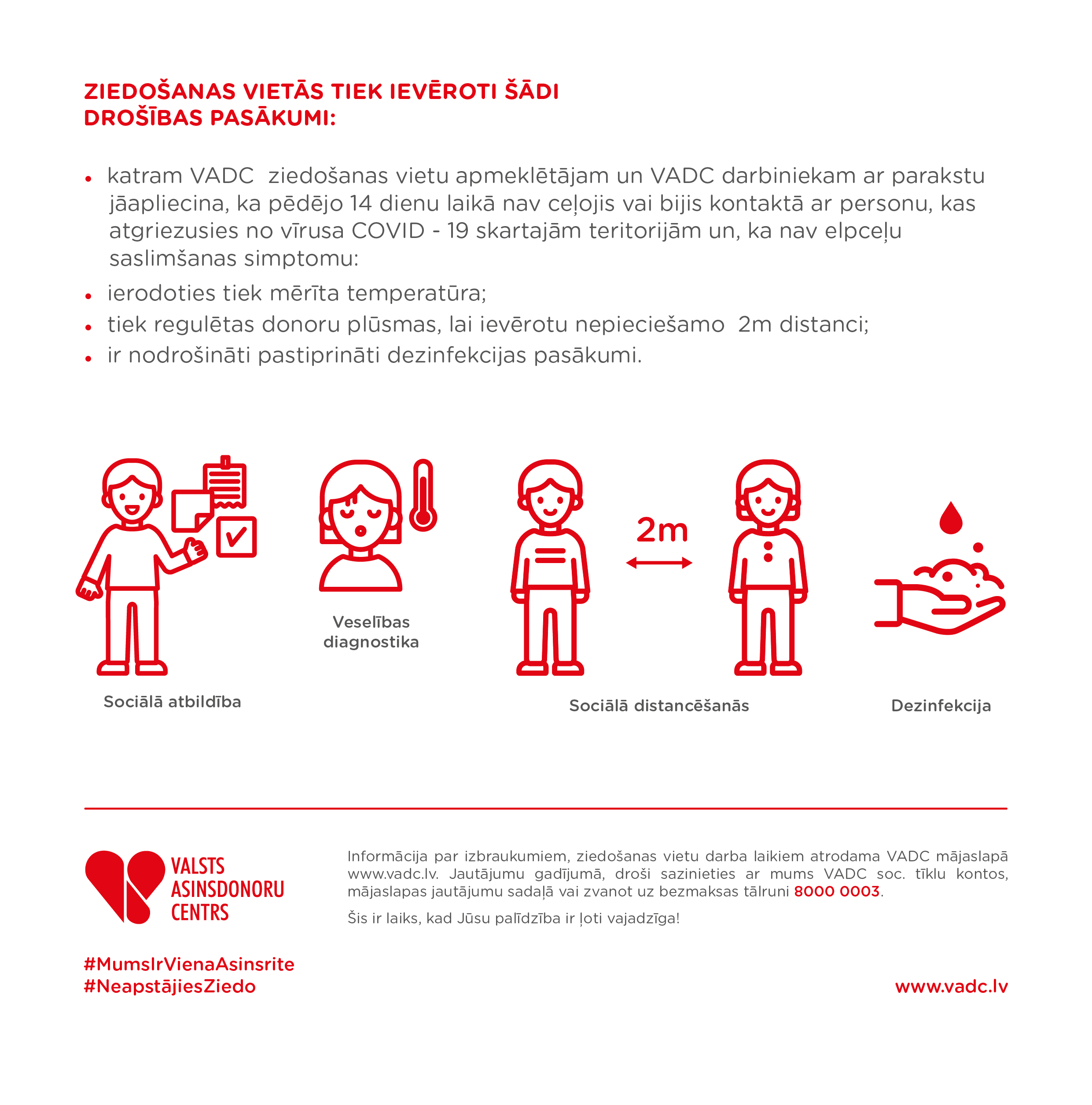 Visās ziedošanas vietās tiek ievēroti pastiprināti piesardzības pasākumi, lai garantētu drošu vidi. VADC prioritāte šajā sarežģītajā periodā ir rūpēties gan par VADC personāla, gan donoru drošību, kā arī nodrošināt drošus asins komponentus slimnīcām.