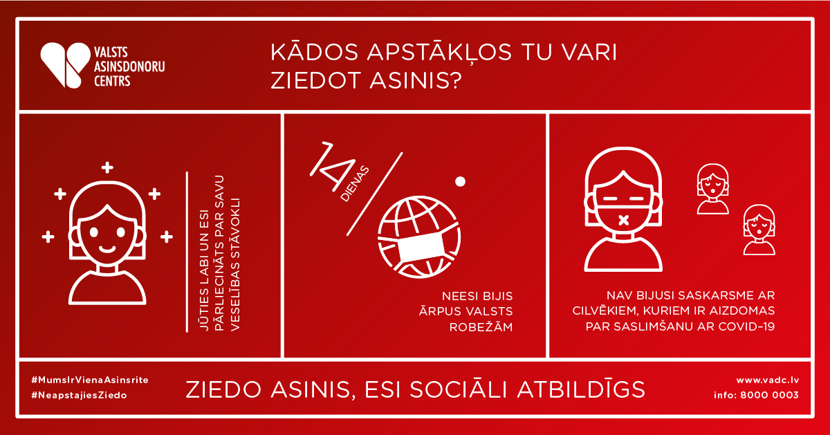 Saistībā ar situāciju valstī, vēlamies vērst uzmanību, ka ārstniecības iestāžu darbs nav apturēts, pacientus turpina ārstēt pēc nelaimes gadījumiem, traumām un citām smagām saslimšanām, tāpēc slimnīcu pieprasījums pēc asins komponentiem nav mazinājies. Ievērojot visus drošības nosacījumus, asins ziedošana nav uzskatāma par masu pulcēšanās pasākumu, bet ir atbalstāma un veicināma arī šajā sarežģītajā laikā.
