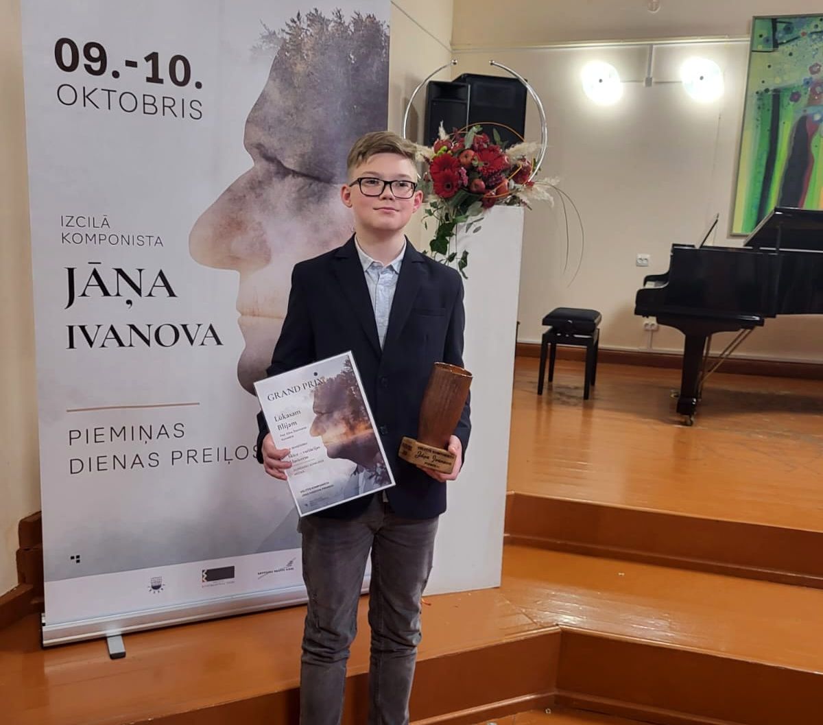 Arī šogad laureātu vidū mūsu Engures Mūzikas un mākslas skolas jaunais komponists un pianists Lūkass Blija, kurš savu GRAND PRIX saņēma par Skici – variācijām klavierēm „Padziedi, mazputniņ”. Augstu novērtēts jaunais mākslinieks tika jau pagājušogad (1. vieta par 2 skicēm klavierēm „Ezis” un „Lavīna”).