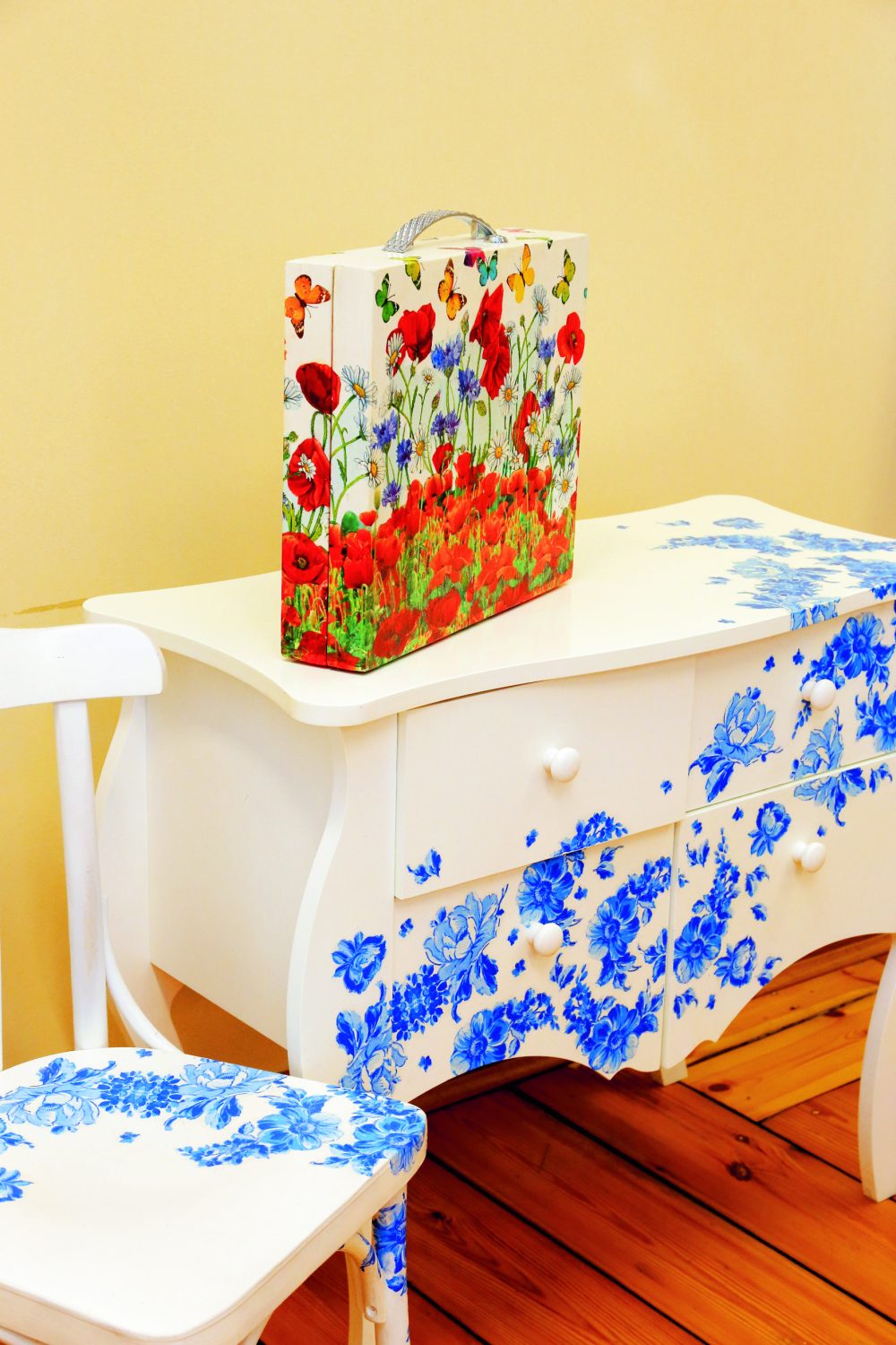 Izstādē skatienu priecēs dekupāžas risinājumi uz dažādām virsmām – lādītēm, šķīvjiem – un pat padomju laika “diplomāta” uzziedināšana vasaras pļavu ziedu krāšņumā. Pārsteigums ir gan kleita – vides objekts, gan arī no audumu fragmentiem speciālā tehnikā darinātā elegantā žakete. Izstādes romantiskie darbi pieder Silvijai Bērziņai – viņas rokrakstu nevar nepazīt. Tās ir perfekti ar karalisku audumu un dažādiem rotājošiem elementiem apvilktas visdažādākās kārbiņas. Turklāt, visus apmeklētājus sagaidīs amizanto Lieldienu zaķu ģimenīte.