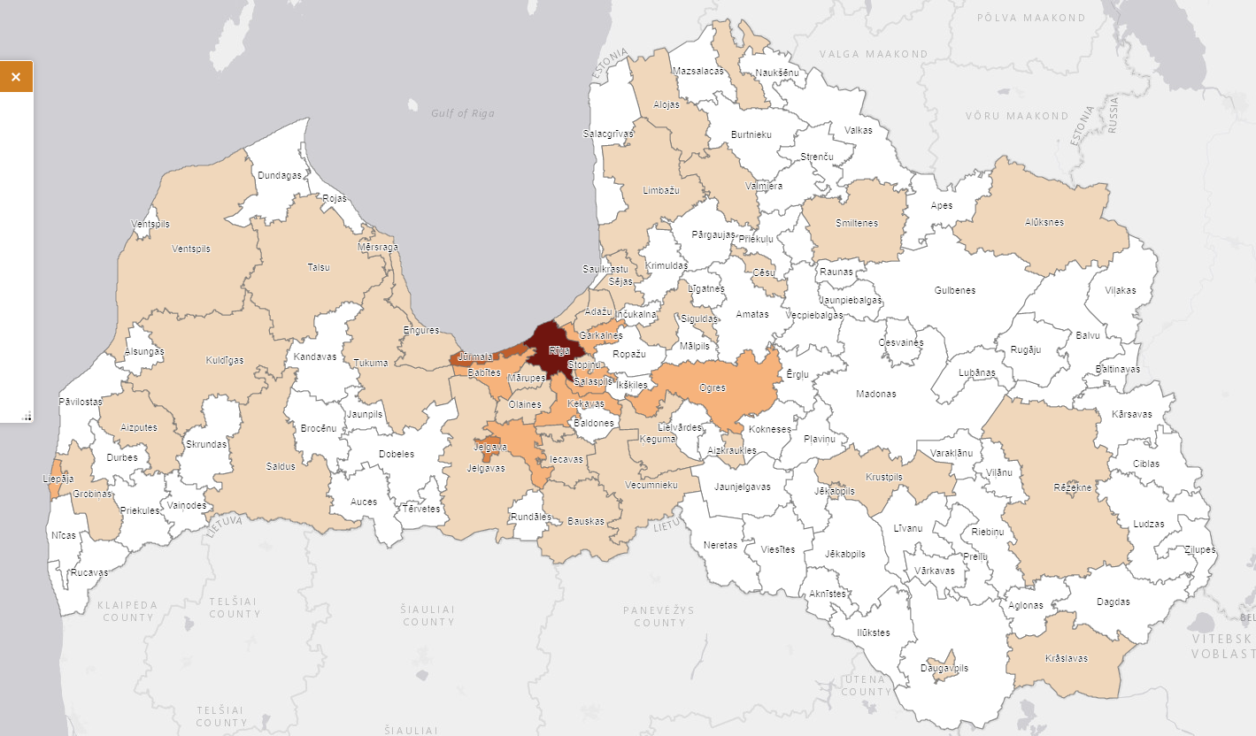 Līdz šim Covid-19 konstatēts kopumā 45 pašvaldībās – Jelgavas, Talsu, Tukuma, Iecavas, Ķeguma, Alojas, Mārupes, Rūjienas, Rēzeknes, Limbažu, Stopiņu, Sējas, Siguldas, Ogres, Carnikavas, Garkalnes, Cēsu, Smiltenes novadā.