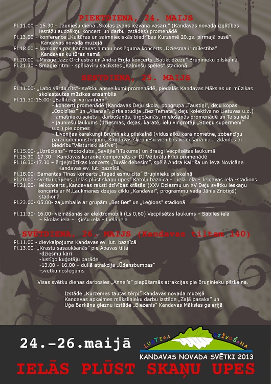 Šodien, 24. maijā, skolas zvans pilsētas Promenādē simboliski ieskandinās svētkus un arī vasaru. Svētku koncertā dziesmas vīsies ar dejām novada skolu un pirmsskolas izglītības iestāžu audzēkņu priekšnesumos, bet vakarā kultūras namā koncertā «Dziesma ir mīlestība» pirmatskaņojumu piedzīvos Kandavas himna. Sestdien Dārza iela pārtaps Jauniešu ielā ar emocionālu aktivitāšu daudzveidību, kur, arīdzan tradīciju ievērojot, tiks sveikts jauniešu centra «Nagla» 5555. apmeklētājs.