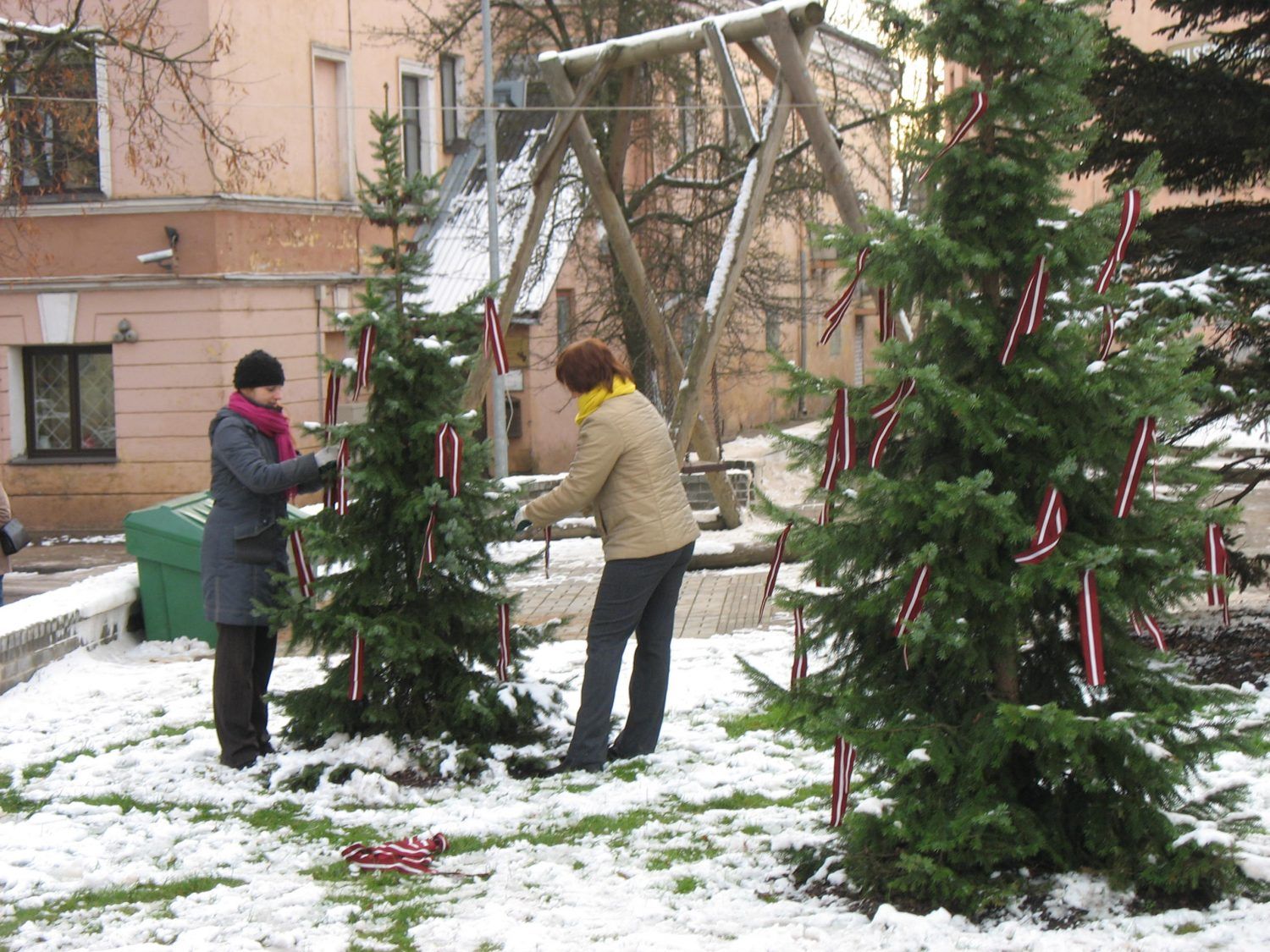 Lai, sagaidot valsts dzimšanas dienu, iedzīvotājiem būtu pacilātāks noskaņojums, Tukuma domes speciālistes Aivita Milta un Maija Fogele ar košām lentām izgreznoja egles laukuma vienā stūrī.