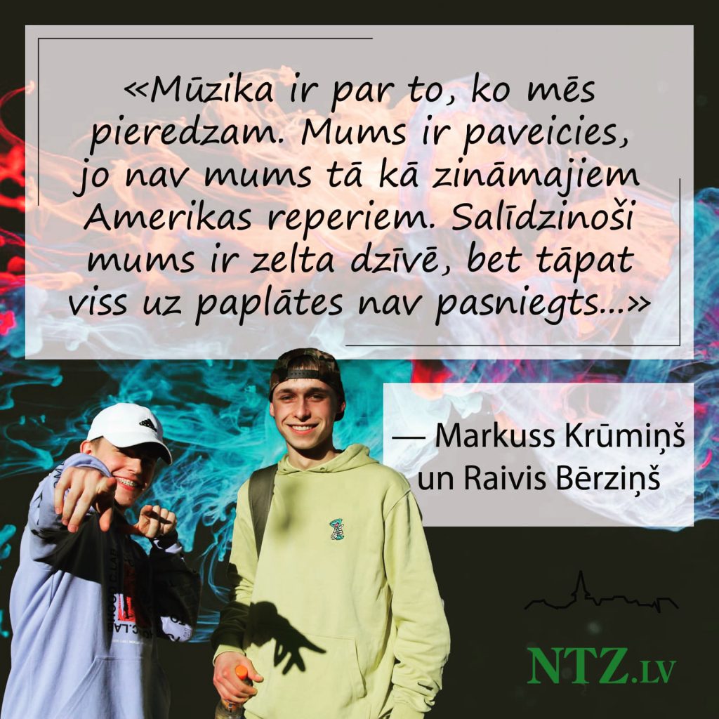 Tātad pāris dienu pirms mūsu sarunas – 20. aprīlī – Markuss un Raivis laida klajā savu pirmo dziesmu, nu vismaz pirmo, kas nodota publiskai apskatei, jo, kā noskaidrojām, dziesmu esot vairāk. “Dziesmas mums jau ir, lēnām sāksim tās laist ārā. Tagad gribējām paskatīties, kāda būs interese, kas notiks, kad palaidīsim pirmo, kāda būs atsaucība.”