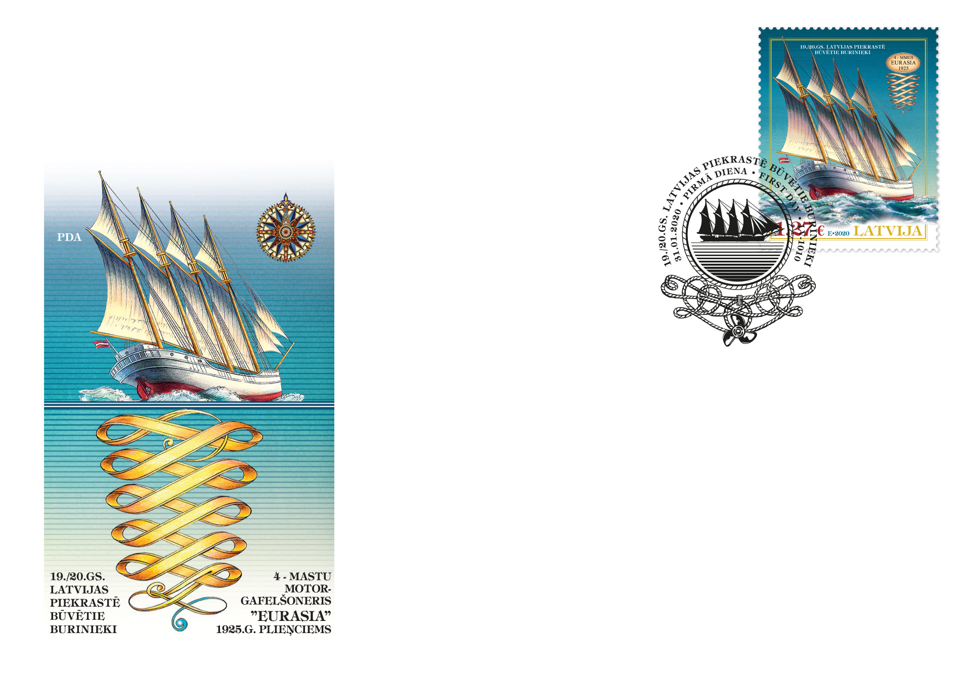 Uz jaunās vēsturisko kuģu sērijas pastmarkas attēlots 1925.gadā Engures novada Plieņciemā darinātais četru mastu buru motorkuģis Eurasia, kuru būvējis slavens latviešu kuģu būvētājs Mārtiņš Morgenšterns. Eurasia bija pēdējais Latvijā uzbūvētais lielākais koka kuģis, kura garums bija 45,5 metri, bet kravnesība – 513 tonnu. 1933.gadā, ar kravu dodoties pāri Atlantijas okeānam, kuģis cietis avārijā un nogrimis.