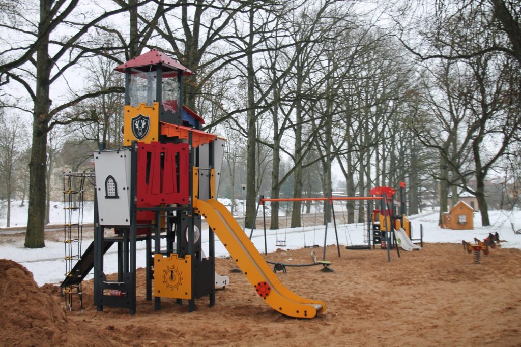 Kopumā uzstādīja divas rotaļu iekārtas ar slidkalniņiem, alpīnistu sieniņu, trosēm u.c. elementiem, kā arī atsperšūpoles – zirdziņus, līdzsvara šūpoles un šūpoles bērniem dažādos vecuma posmos. Kas ne mazāk svarīgi, šoreiz izlēma laukumiņu pielāgot Jaunpilis aurai, proti, ierīces rotā tornīši un citi elementi, kas atgādina viduslaiku pili. Laukumiņš jau nodots ekspluatācijā – tātad ir izmantojams. Bet, ja gadās pamanīt, piemēram, kādu bojājumu, Jaunpils un Viesatu pagastu pārvalde aicina ziņot saimniecības pārzinim: 26221202.