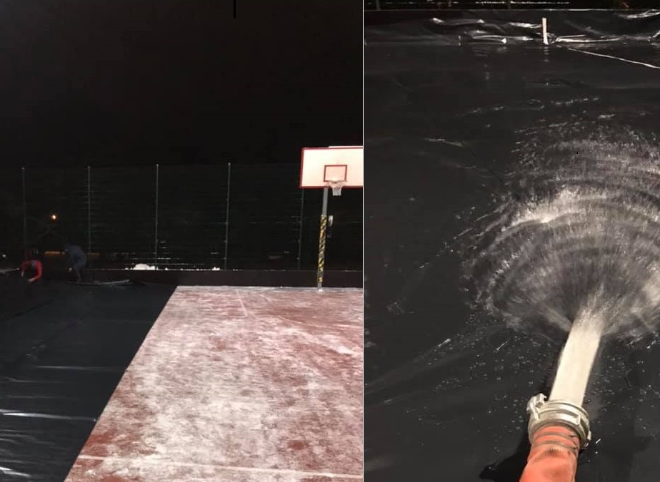 Jau pagājušā nedēļa, kad termometra stabiņš noslīdēja zem nulles atzīmes, jaunpilnieki uzsāka hokeja laukuma veidošanu jaunizveidotajā basketbola laukumā.