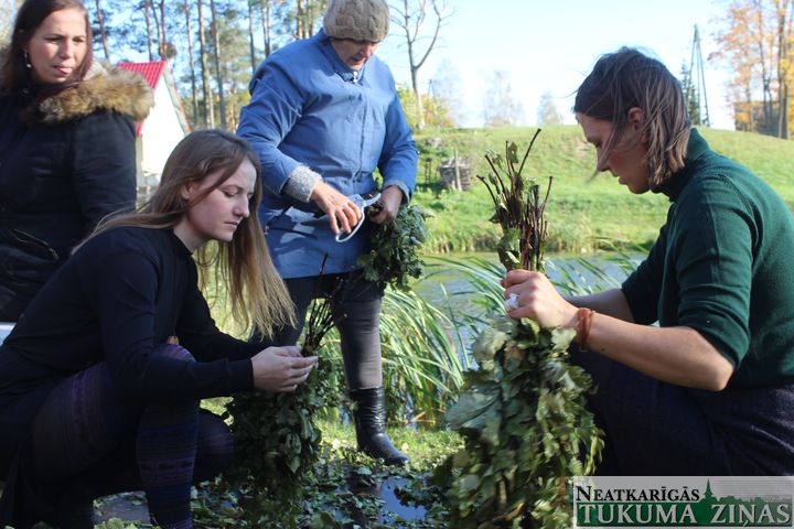 Pēc oficiālākās runu teikšanas un lentas griešanas visi tika aicināti ieturēties ar pīrādziņiem un siltu tēju… Un tad – pie praktiskajām lietām. Visiem, kas vēlējas, bija iespēja iemācīties, kā pareizāk siet pirts slotiņas, lai pašam pērējam būtu vieglāk un lai tās neizjuktu pie pirmajiem pērieniem. Kad slotiņas bija gatavas, tās ielika mērcēties, bet tikmēr visi devās uz pirts telpām, kur Lāsma Zāgmene un A. Vilde Batņa iepazīstināja ar aromterapijas pasauli – ar to, kā pareizāk aromātiskās eļļas lietot, ejot pirtiņā un arī ikdienā. Katrs varēja izvēlēties sev tīkamāko aromātu un izveidot savu īpašo berziņu – skrubīti. Un tad tie, kas vēlējās varēja par ziedojumiem doties kārtīgi izkarsēties un nopērties. Silvas mazā meitiņa Elziņa bija visnepacietīgākā un nevarēja sagaidīt, kad varēs iemēģināt jauno pirtiņu…