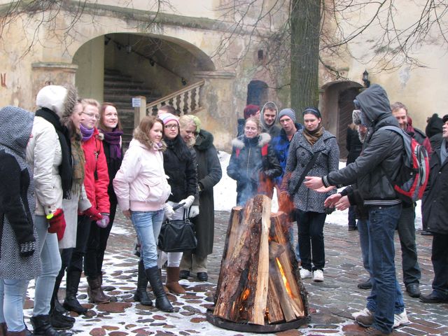 Pils pagalmā pasākuma dalībnieki drēgnumu no kauliem varēja aizgaiņāt, cienājoties ar siltu tēju un uzkožot sātīgas ķiplokmaizītes. Skolas puiši gan atrunājās, ka viņiem vēl “ar meitenēm jābučojas”, un dažs tiešām no maizītēm atteicās, tomēr, labprātīgi un nepierunājot, viņi izpalīdzēja klasesbiedrenēm aizdegt svecītes, uz ko, pieminot 20 gadus senos notikumus, aicināja muzeja vadītāja Ligija Rutka.