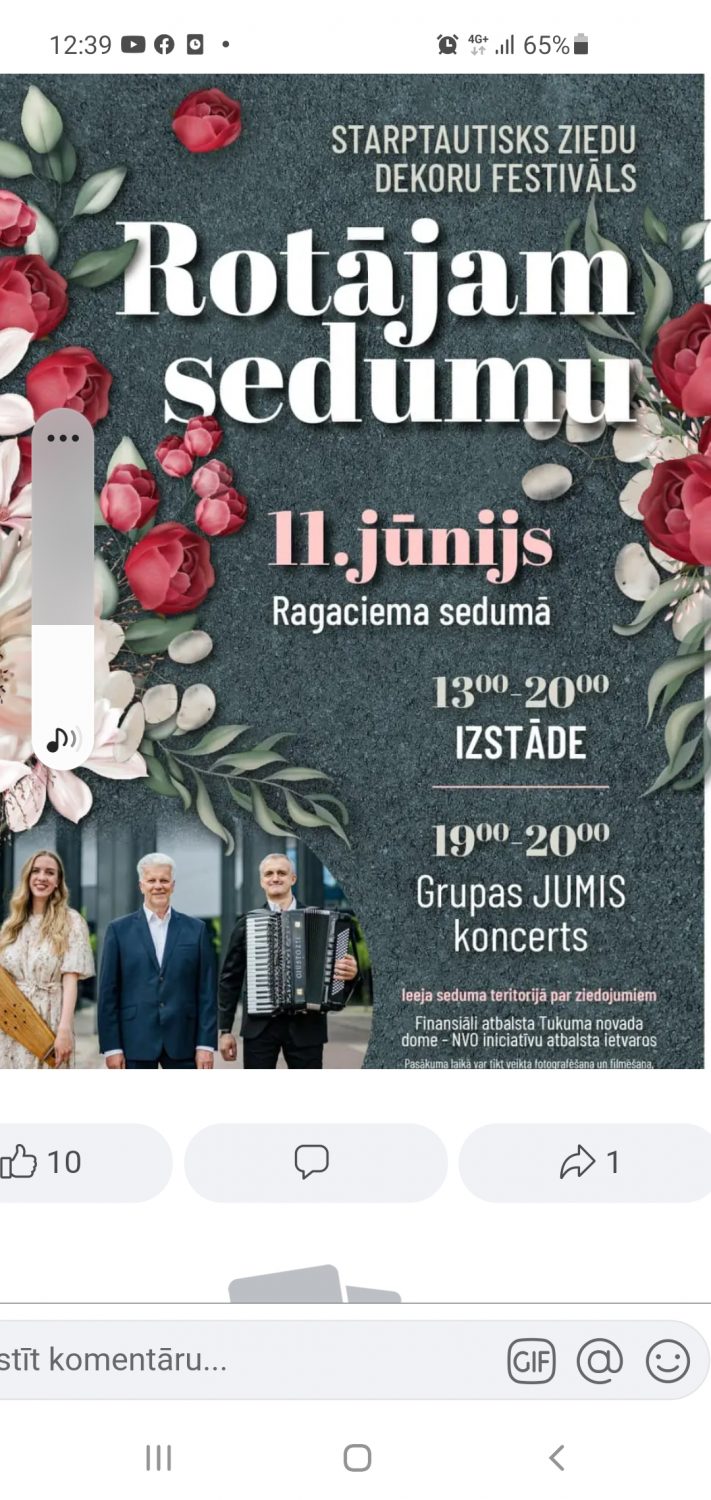 Šodien,11. jūnijā, jau no 12.00 Ragaciema sedumā noris floristikas festivāls – tīklu mājiņas un to apkārtne ietērpta ziedu rotājumos. Visas dienas garumā būs iespēja balsot par sev tīkamāko darbu, fotografēties,būs izstādīti Lapmežciema gleznošanas studijas dalībnieku darbi. Tāpat ciemos atbraukusi Mobilā dabas izglītības klase, darbosies kafejnīca un būs iespēja iepazīt un iegādāties “Sanitas dabas veltes”, kas tapušas tepat Antiņciemā. Vakarā,19.00 – koncerts, kurā uzstāsies grupa “Jumis”.