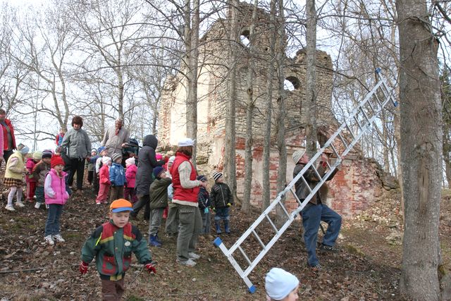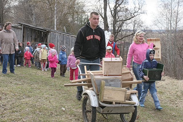 Šodien Pūres bērnudārza «Zemenīte» bērni, viņu audzinātājas Kapličkalna kokos uzlika putnu būrīšus.
