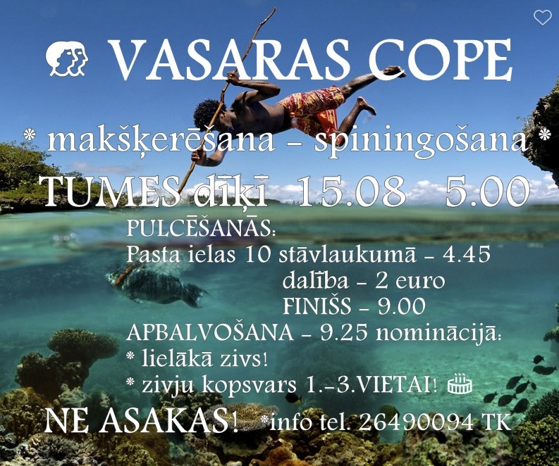 Šovasar pēc makšķernieku ieteikuma sacensības copmaņiem 15. augustā Tumes pagasta dīķī sāksies jau agrā rīta stundā 5.00 (pulcēšanās jau 4.45)! Ceram, ka lomi būs krietni bagātāki. Mači risināsies divās kategorijās, kur ikviens copmanis varēs izvēlēties sev tīkamāko zivju ķeršanu, vai nu spiningojot vai makšķerējot, un finišs šoreiz būs pēc 4 stundām… Gaidīsim entuziastus gan lielu, gan mazus Tumē, lai veiksme, jebšu kā saka ne asakas!