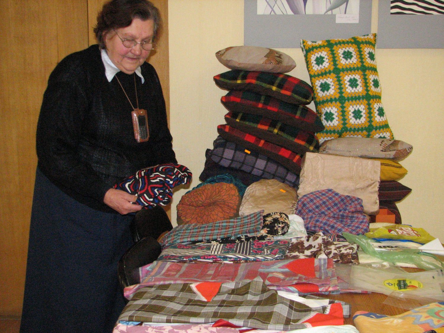 Visplašākajā izvēlē bija adījumi: rakstainas zeķes, cimdi, koši, krāsās saskaņoti adījumu komplekti (cimdi, zeķes, šalle), kā arī ērtas, siltas adītās čībiņas. Kādā stendā varēja iegādāties pašdarinātus mīkstus dekoratīvos spilventiņus un ķeblīšu pārvalkus, kā arī noaustus grīdas celiņus. Lielu pircēju piekrišanu izpelnījās praktiskās, galdā liekamās dārza veltes – sīpolu saišķīši, ķiploku galviņas, ķirbji un, protams, Ziemassvētku galdā ceļamie pelēkie zirņi. Arī medus burciņa brīnišķīgi noderēs gan pašu saimei, gan vērtīgai un veselībai noderīgai dāvaniņai.