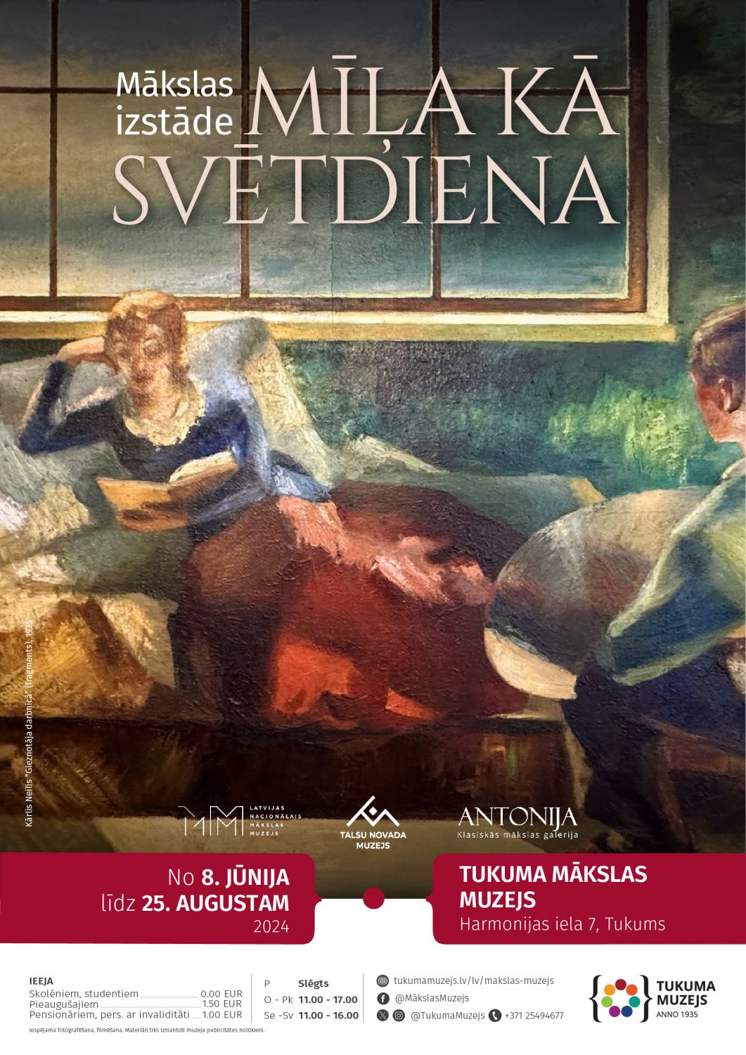 Izstāde no 8. jūnija līdz 25. augustam. Izstādes apskate ar muzeja biļeti. Informācija: 25494677, makslasmuzejs@tukumamuzejs.lv Adrese: Harmonijas iela 7, Tukums. www.tukumamuzejs.lv