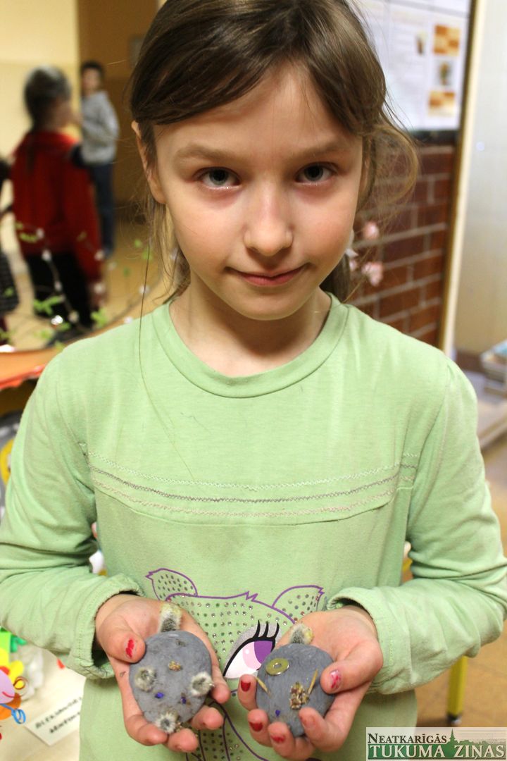 Jāteic, jau skolas foajē mūs iepriecināja Lieldienām veltītie darbi, kas pārsteidza ne vien ar izmantotajām tehnikām, bet arī ar akurātu risinājumu. To vidū pamanījām divas pelēkas pelītes. To autore Inga Beitane no 1.b klases pastāstīja, ka tās darinājusi no divām kartupeļa pusītēm, kuras nokrāsojusi pelēkā krāsā un izrotājusi ar pūkainiem pūpoliņiem.