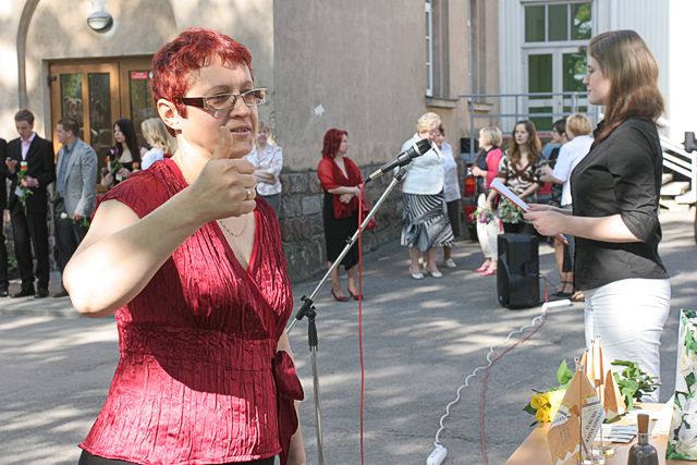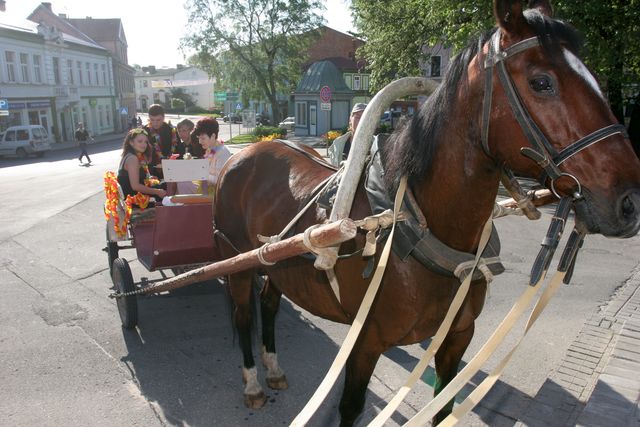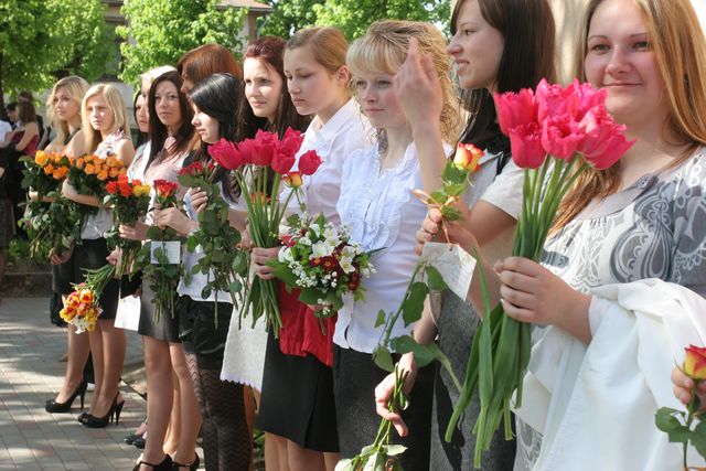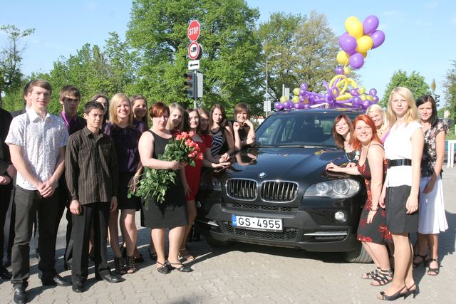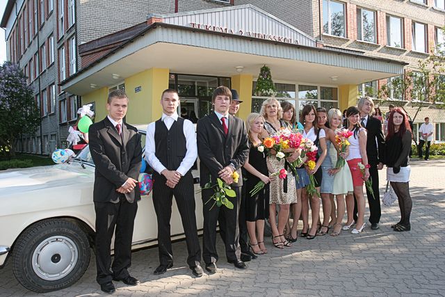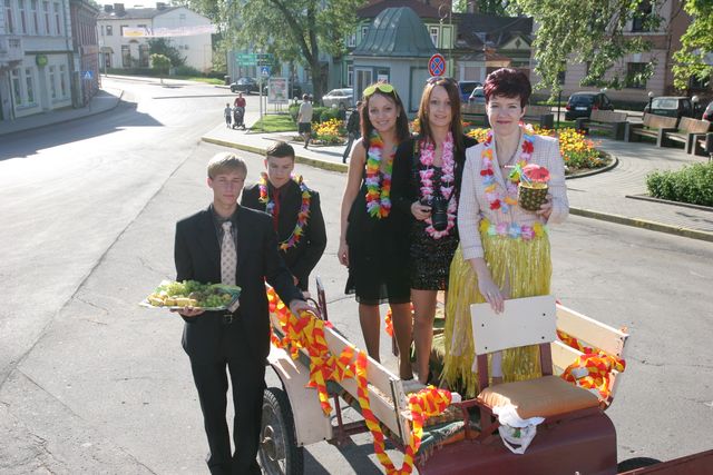 Vēlāk raiņi centrā pie strūklakas kopā ar skolotājām bildējās. Katru īpaši uz skolu aizveda. Zirga pajūgā, ar mocīti, bet, piemēram, skolotāju Initu Rudenko viņas puiši cauri pilsētai nešus aiznesa. Pie Tukuma 2. vidusskolas tāds pats ļembasts. Skolotājus nesa, veda ar veco, labo krievu «Volgu» un arī ar limuzīnu. Tukuma 2. pamatskolā šogad pirmais izlaidums. Devītie audzinātāju Agritu Auziņu līdz skolai atvizināja ar pašvaldības policijas automašīnu un, sirēnām kaucot, lai visi redz un zina, ka drīz atkal bērni kā putnēni no ligzdām izlidos. Mēs arī visu mūsu lasītāju vārdā novēlam skolēniem un viņu skolotājiem, vecākiem veiksmi eksāmenos un turpmākajā dzīvē.