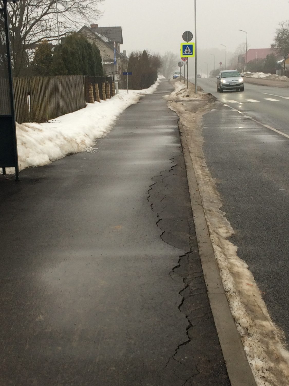 Redakcija: kā pārliecinājāmies, daļā ietves – posmā no jaunās autobusa pieturas līdz Miera ielai –, ietves ārējās daļas asfalts tiešām ir saplaisājis un, tēlaini runājot, izskatās gluži kā maizes rieciens, no kura kāds būtu vēlējies nokost kumosu… Savukārt, rūpīgāk izpētot brauktuvi, pamanījām, ka plaisas izveidojušās arī pie divām akām, no kurām viena jau tā izkustējusies, ka braucot skan vien. To, ka īsti labi nav, tiešām var labi pamanīt, tāpēc, lai noskaidrotu, kas šādām problēmām pie vainas, piemēram, vēlais asfaltēšanas laiks vai kas cits, vaicājām SIA «Strabag» valdes loceklim Jurim Dupuram. Viņš skaidroja, ka ir informēts par notikušo un nosauca to par asfalta ieklāšanas brāķi: “Mums arvien ir spēkā būvdarbu garantija, un, tiklīdz iestāsies labāki laika apstākļi, mēs par saviem līdzekļiem šīs problēmas izlabosim. Kas attiecas uz akām, tās ierīkoja apakšuzņēmēji, taču mēs noteikti pārbaudīsim, kāpēc aku vietas ir deformējušās, un arī tas tiks izlabots.” Vaicāts, vai pie vainas varētu būt tas, ka asfalts tika ierīkots septembrī, J. Dupurs skaidroja, ka visi līguma termiņi būvdarbu laikā tikuši ievēroti, turklāt asfalta ierīkošanas brīdī laika apstākļi bijuši labi: “Iespējams, vēl viens iemesls bija saistīts ar ietves pamatnes blietēšanu – tā kā vietām ietve ir ļoti tuvu ēkām, iedzīvotāji iebilda, ka tuvu tām strādā ar lielo tehniku, kas blietē pamani, tāpēc, iespējams, arī šādas problēmas varēja gadīties, bet, kā jau minēju, tas viss tiks izlabots.”