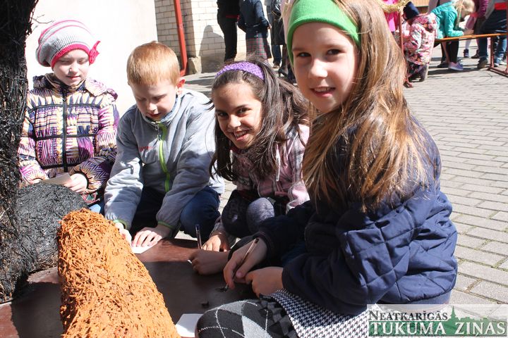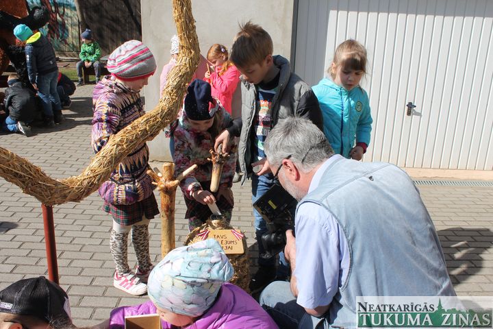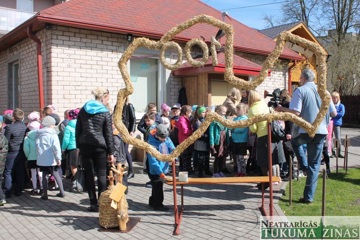 Kā zināms, tās ašās idejas nereti ir tās labākās un tā – savs sveiciens valsts svētkos tapis arī «Salmu darbnīcā» Tukumā. Šorīt ar dziesmu un laba vēlējumiem Latvijai, te nelielā improvizētā ceremonijā tika atklāts īpaši valsts simtgadei izveidots foto rāmis, kas, protams, no salmiem. Kā pirmajiem nofotografēties tajā bija iespēja Tukuma 2. pamatskolas un Tukumā 2. vidusskolas 1. un 2. klasītēm kopā ar saviem skolotājiem. Tāpat katrs uzrakstīja apsveikumu vai vēlējumu valstij, kas tika ievietoti īpaši šim mērķim izgatavotā pudelē un kā stāsta darbnīcas saimniece Kristīne Zihmane-Rītiņa, tā tiks atvērta uz valsts svētkiem 2018. gadā. Bet līdz tam – savu vēstījumu te var atstāt jebkurš darbnīcas apmeklētājs. Bet šajā reizē, vēl pirms lielās fotografēšanās un arī citu salmu veidojumu sīkākas izpētes, dziesmu Latvijai veltīja Emīlija Šmita.
