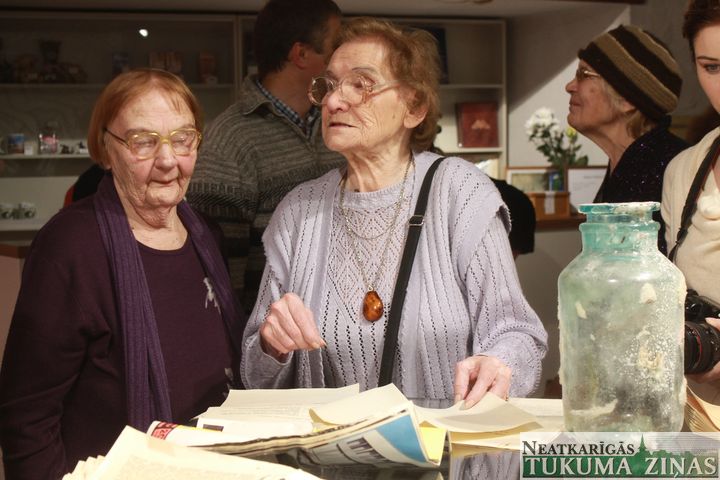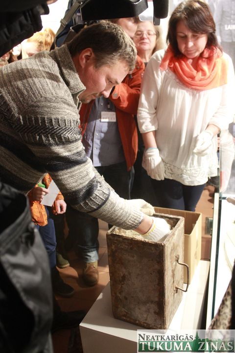 Atverot vienu aizmetinātās kastes daļu, varēja ieraudzīt stikla burku ar stikla korķi. Burka no visām pusēm bija aplikta ar stikla vati, bet pati burka aiztaisīta ar vasku. Burkā saritinātā veidā bija ielikti 1967. gadā izdoti preses izdevumi – žurnāla «Zvaigzne» 1967. gada 20. oktobra numurs, laikraksta «Komunisma Rīts» 20 dažādu mēnešu numuri, divi laikraksta «Cīņa» numuri, izdevums «Saimnieciski-finansiālie rādītāji Tukuma rajona kolhozos un padomju saimniecībās par 1966. gadu», kā arī vēstījums paaudzēm, kas svinēs Lielās oktobra sociālistiskās revolūcijas 100. gadadienu.  No kapsulas izņemtie dokumenti šobrīd ir apskatāmi Pils tornī.