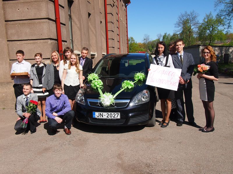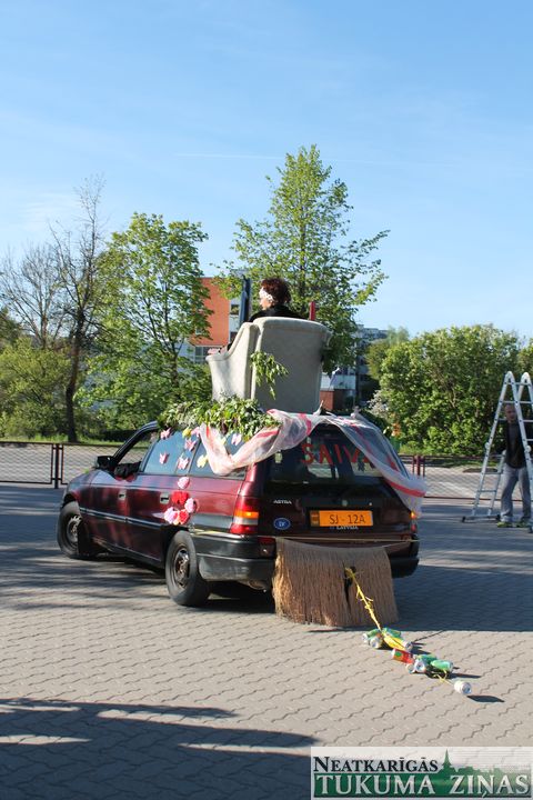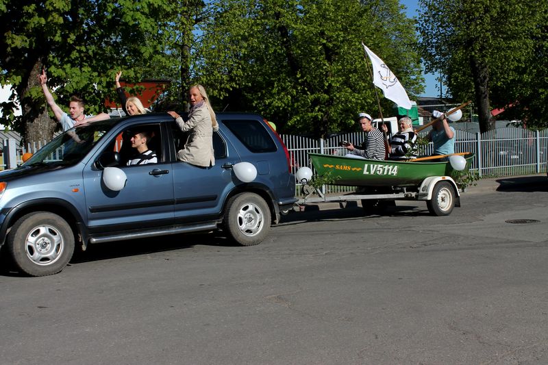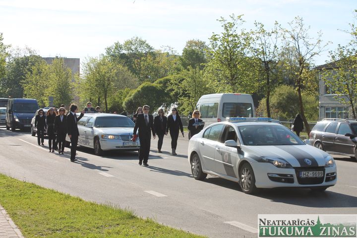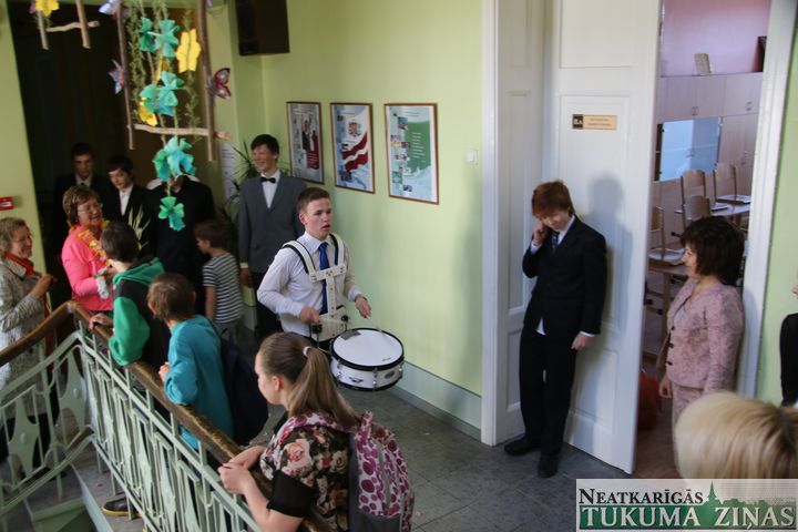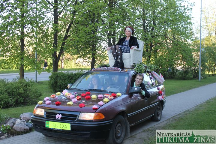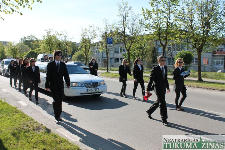 Tukuma 2. vidusskolas abas 12. klases sekoja tradīcijai – skolotāja Saiva Jansone uz darbu “atbrauca” atpūtas krēslā, kas piestiprināts pie automašīnas jumta, un tika cienīgi sagaidīta skolas priekšā, savukārt Dinu Baltakmeni baltā limuzīnā pavadīja melnā tērpts un cienīgs miessargu kortežs.