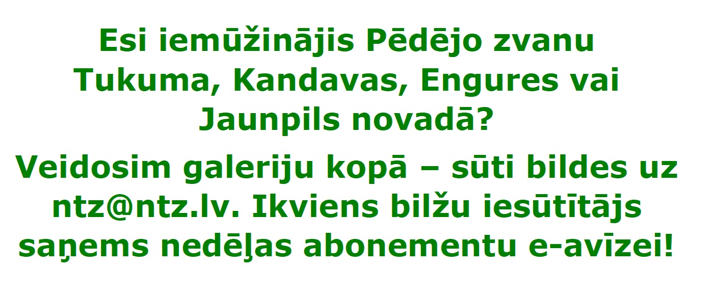 Esi iemūžinājis Pēdējo zvanu Tukuma, Kandavas, Engures vai Jaunpils novados? Veidosim galeriju kopā – sūti bildes uz ntz@ntz.lv. Ikviens bilžu iesūtītājs saņems nedēļas abonementu e-avīzei!