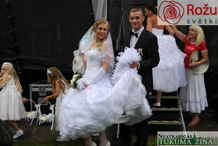 Lietus nespēja aizbiedēt kāziniekus, drīzāk deva nelielu atelpu pēc sutīgās priekšpusdienas. Kāzu kleitas un līgavas uz velosipēdiem. Retro automašīnas un floristu darbi visā pilsētā. Un, protams, lielais rožu vainags, kāzu tosti un uzrunas. Valsis, mičošana un dejas – dažam, arī līdz rītam.