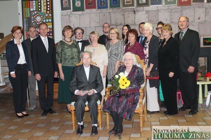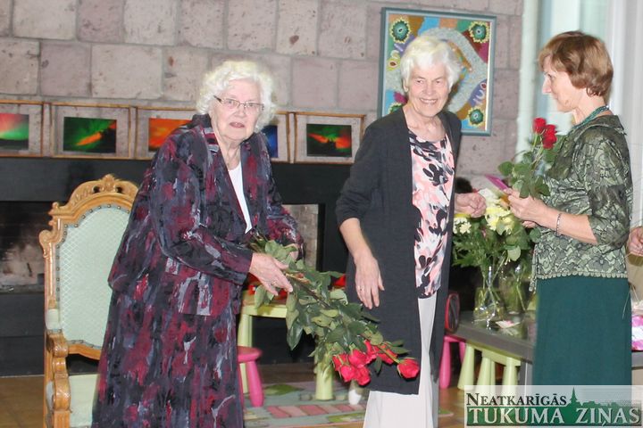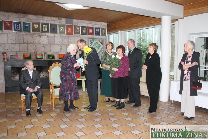 Svētdienā, 26. oktobrī, Tukuma Raiņa ģimnāzijas skolotāji direktores Guntas Aumales vadībā un kora «Savējie» dziedātāji skolotājas Rasmas Valdmanes vadībā sveica savu kolēģi Tiju Kalniņu 90. dzimšanas dienā.