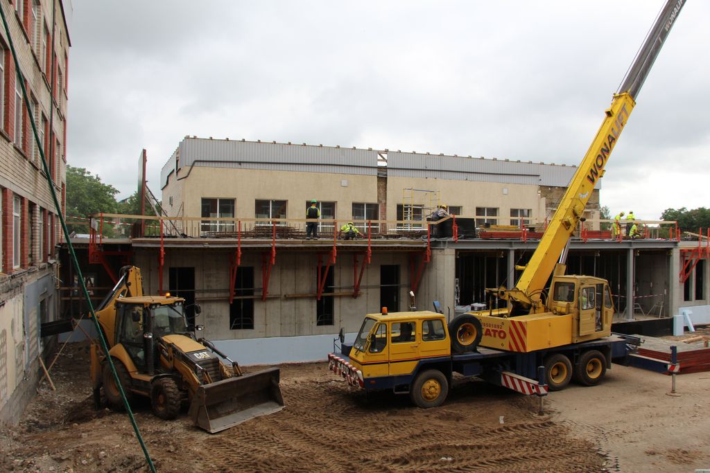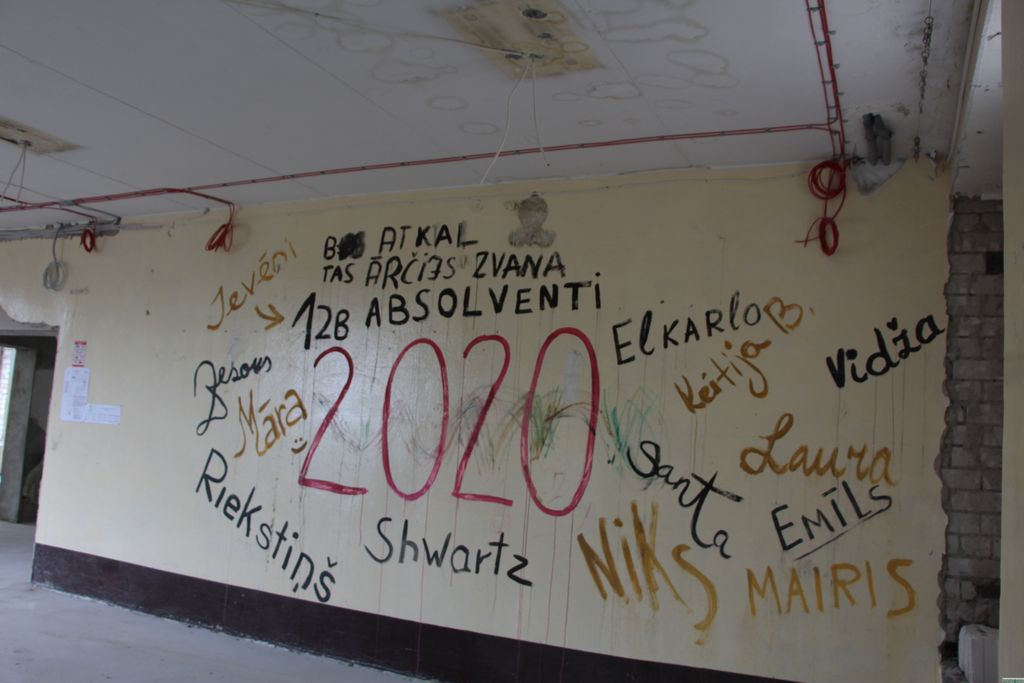 Kā pārliecinājāmies, izstaigājot visu skolas ēku no pagraba līdz trešajam stāvam, šobrīd būvnieku “pieskāriens” redzams pilnīgi visās telpās, atklājot, piemēram, dažādus sienu krāsu slāņus, kas ”uzkrājušies” 50 gadu laikā. Tiesa, tā kā sienu segums vēl nav atjaunots, vietām uz tām redzamas arī audzēkņu atstātās “pēdas” – zīmējumi un sveicieni skolai un skolotājiem ar audzēkņu vārdiem un uzvārdiem, kas jau pavisam drīz pazudīs zem jaunas sienu apdares un krāsojuma. Vēl pamanām, ka kabinetos un gaiteņos jūtams lielāks plašums, ko rada tas, ka viss, kas demontējams un lieks, esot noārdīts. Kā izrādās, daudzajos pastāvēšanas gados veikto nelielo remontu laikā skolas ēka tikusi visai pamatīgi pārbūvēta – šis tas izņemts, šis tas piebūvēts, bet šī brīža rekonstrukcijā, kā skaidroja T. Pavilēns, lielākoties plānots atgriezties pie ēkas sākotnējā arhitektoniskā risinājuma, izjaucot, piemēram, mazos kabūzīšus, paplašinot tualetes vai, piemēram, blakus aktu zālei, gluži kā senāk, ierīkojot mūzikas klasi ar labu skaņas izolāciju. Aktu zālē plānots atjaunot skatuvi, kas reiz tikusi nojaukta, lai zālē būtu vairāk vietas. Šobrīd zāles vidū zem pārklāja salikts arī vecais parkets, kuru plānots izmantot atkal, jo tas esot salīdzinoši labā stāvoklī, turklāt – ar ausīm tīkamu skaņu, kas rodoties staigājot.