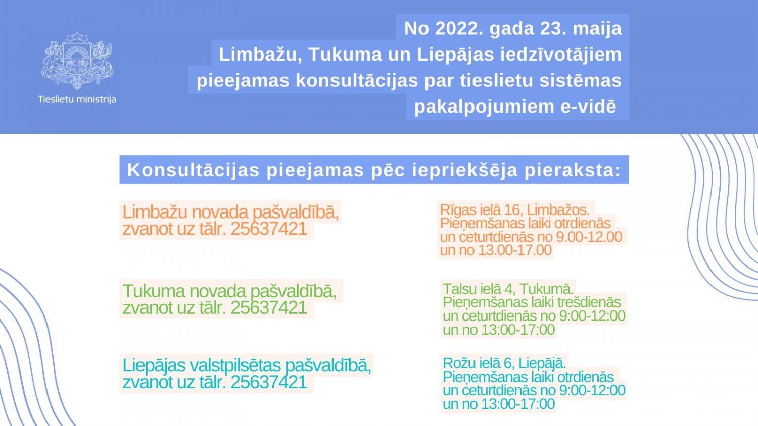 - Tukuma novada pašvaldībā (Talsu ielā 4, Tukumā) pieņemšanas laiki trešdienās un ceturtdienās no 9:00-12:00 un no 13:00-17:00.