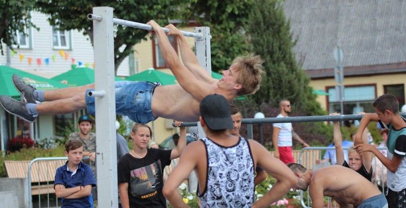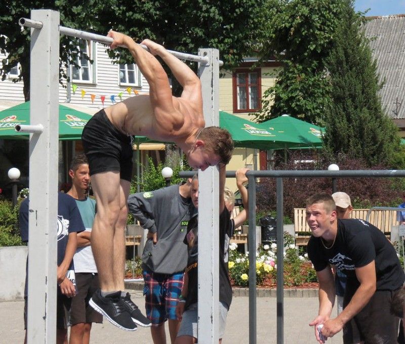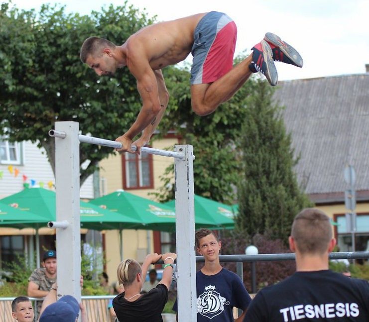 Muscle Up disciplīnā dalībnieki veica izejas virs pievilkšanās stieņa, kurā