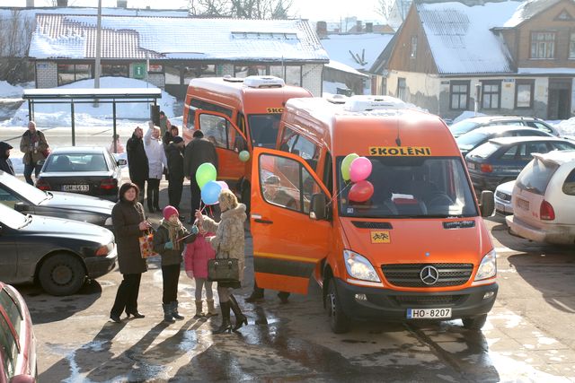 Turpmāk ar tām brauks Tumes un Degoles, Sēmes un Zentenes pagastu bērni. Vakar viņi saņēma divus jaunus 19-vietīgus MERCEDESS BENZ autobusus 56 000 latu vērtībā. Novada dome maksāja tikai 10 procentus no kopējās summas.