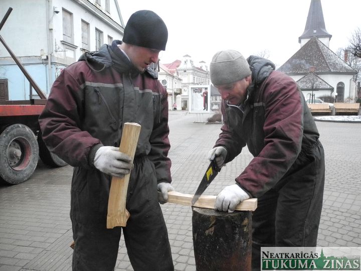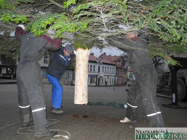 Trešdien, 27. novembrī, Tukumā, Brīvības laukumā cilvēku Ziemassvētku priekam individuālā darba veicējs Ilgvars Jurčs ar Edvīnu Zurģi, Aivaru Driķi un Mārci Jurču pilsētas lielo egli iestatīja.