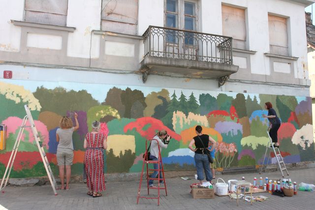 Māksliniece un Tautas tēlotājmākslas studijas vadītāja Inga Brīniņa pastāstīja, ka darbs notiekot atbilstoši mākslinieces Ingemāras Treijas idejai. Ceturtdien I. Treija radīja darba pamatu, kuru šodien papildināja studijas un Tukuma mākslinieku grupas dalībnieku gleznotie ziedi un akcenti.