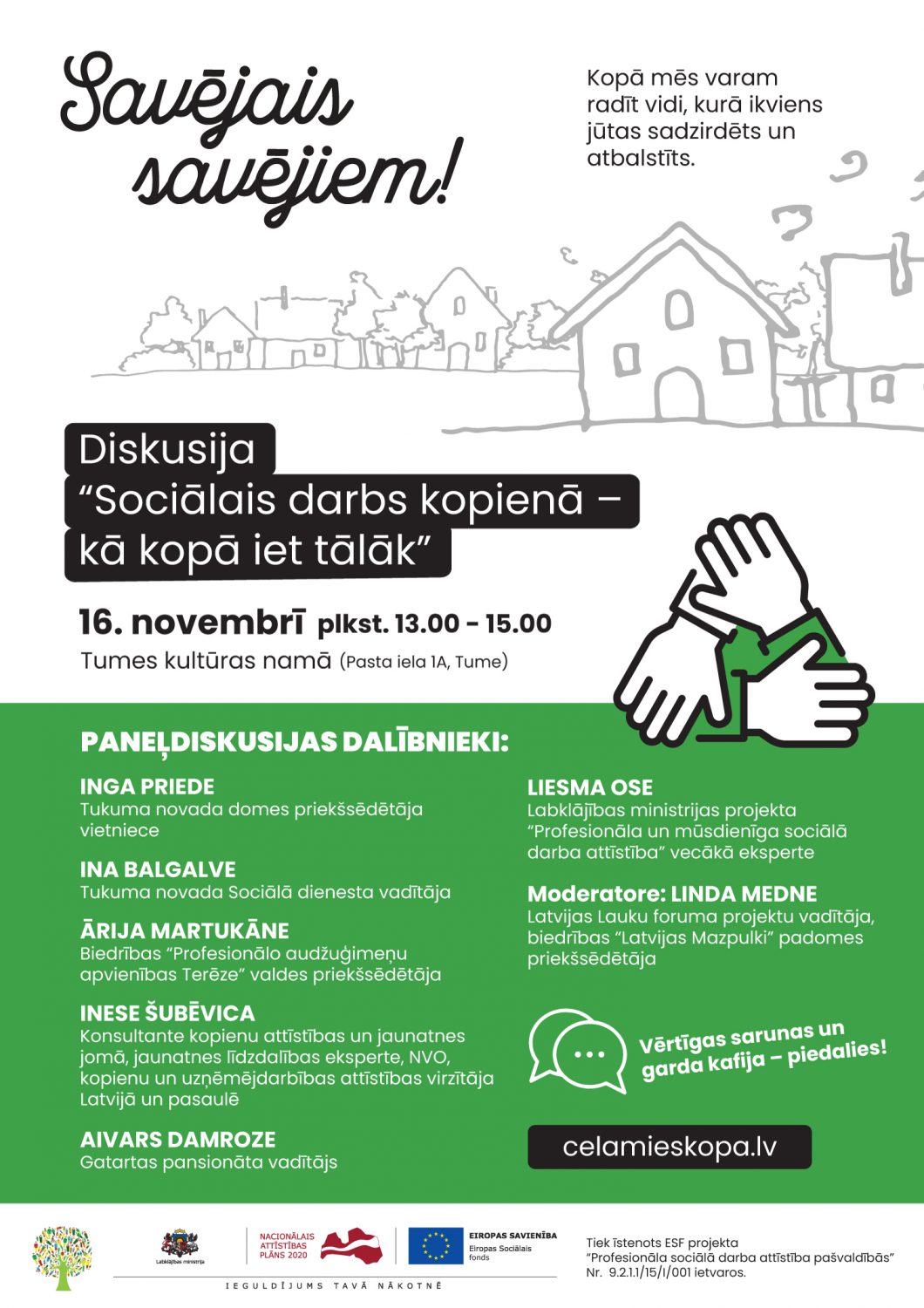 Paneļdiskusijā piedalīsies Tukuma novada domes priekšsēdētāja vietniece Inga Priede, Tukuma novada Sociālā dienesta vadītāja Ina Balgalve, biedrības “Profesionālo audžuģimeņu apvienības Terēze” valdes priekšsēdētāja Ārija Martukāne, kopienu veidotāja, projekta “Profesionāla sociālā darba attīstība pašvaldībās” mācību vadītāja un mentore Inese Šubēvica, Gatartas pansionāta vadītājs Aivars Damroze, kā arī Labklājības ministrijas projekta “Profesionāla un mūsdienīga sociālā darba attīstība” vecākā eksperte Liesma Ose. Diskusiju vadīs Latvijas Lauku foruma projektu vadītāja, biedrības “Latvijas Mazpulki” padomes priekšsēdētāja Linda Medne.