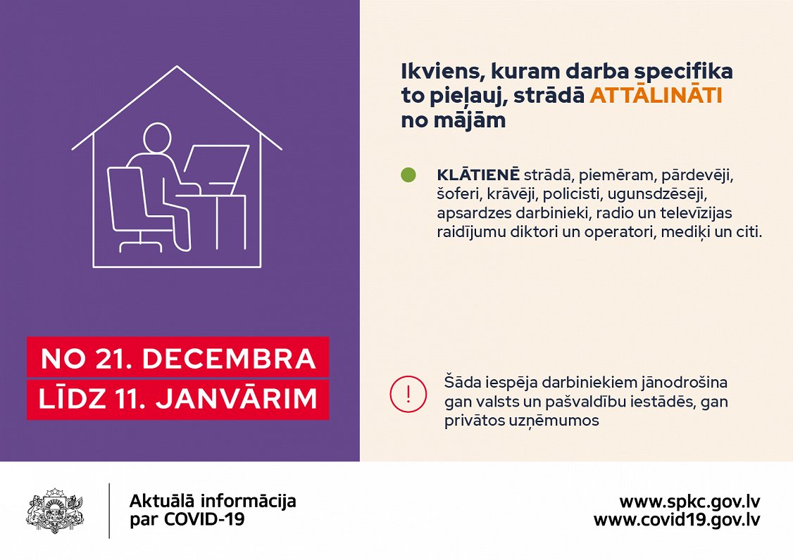 * ikvienam, kuram darba specifika atļauj strādāt attālināti no mājām, tas ir jādara. Darba devēja pienākums ir to nodrošināt. Šie nosacījumi attiecas gan uz valsts pārvaldes un pašvaldību iestādēm, gan privātiem uzņēmumiem. Tas nozīmē, ka klātienē strādās, piemēram, pārdevēji, šoferi, krāvēji, policisti, ugunsdzēsēji, apsardzes darbinieki, radio un televīzijas raidījumu diktori un operatori, mediķi un citi, bet ne, piemēram, biroja darbinieki.